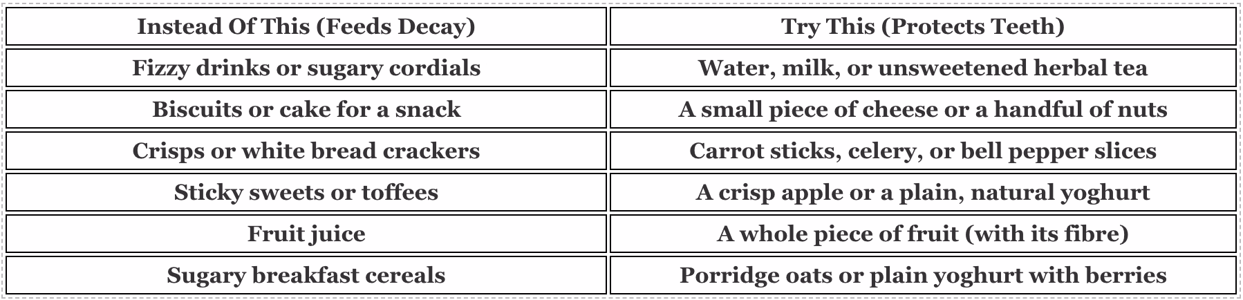 By consciously choosing the foods in the “Try This” column more often, you actively tip the balance in favour of a healthy, cavity-free mouth.