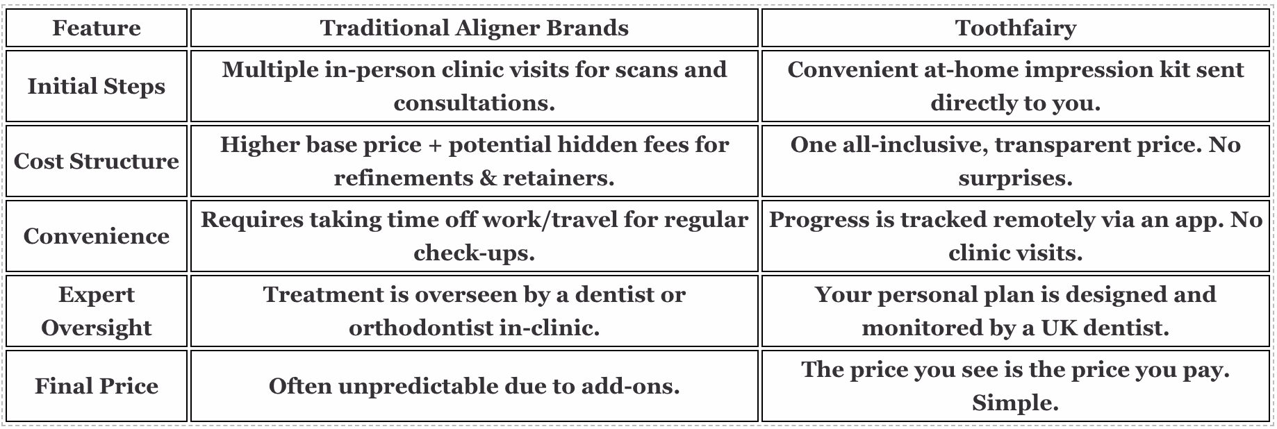 This approach also helps you swerve the hidden fees that often pop up with traditional aligner brands. The image below flags some of the common extra costs you might face elsewhere.