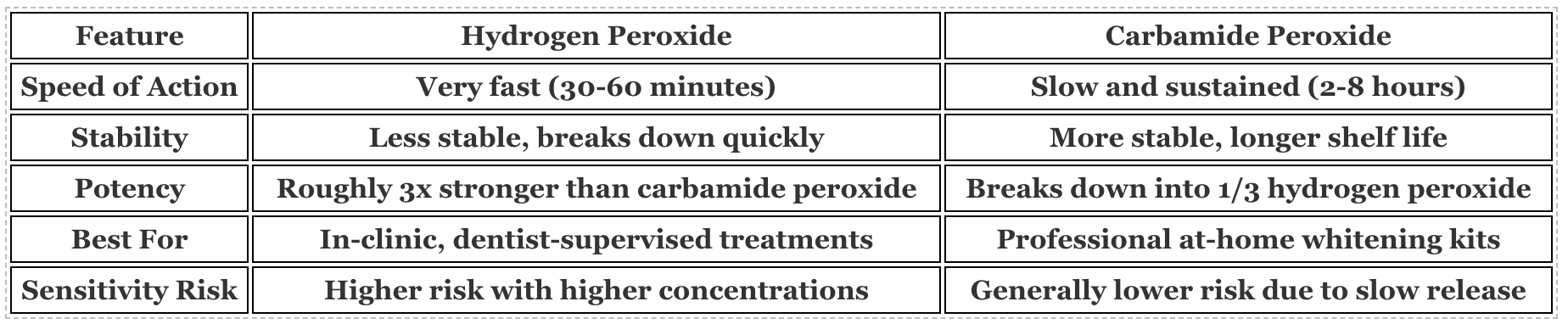 As you can see, hydrogen peroxide is a fast-acting powerhouse, which is why it’s used for those quick in-clinic sessions. Carbamide peroxide, on the other hand, has a slower, more sustained release, making it the perfect, safer choice for gradual whitening in your at-home trays.