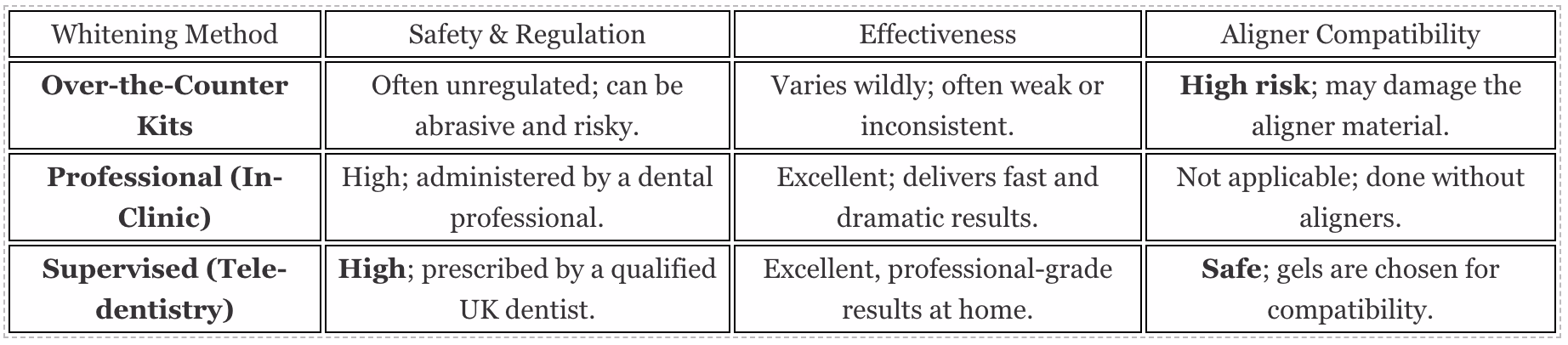 As you can see, the safest and most reliable results always come from a dentist-led approach, whether that’s in a clinic or through a modern tele-dentistry service.